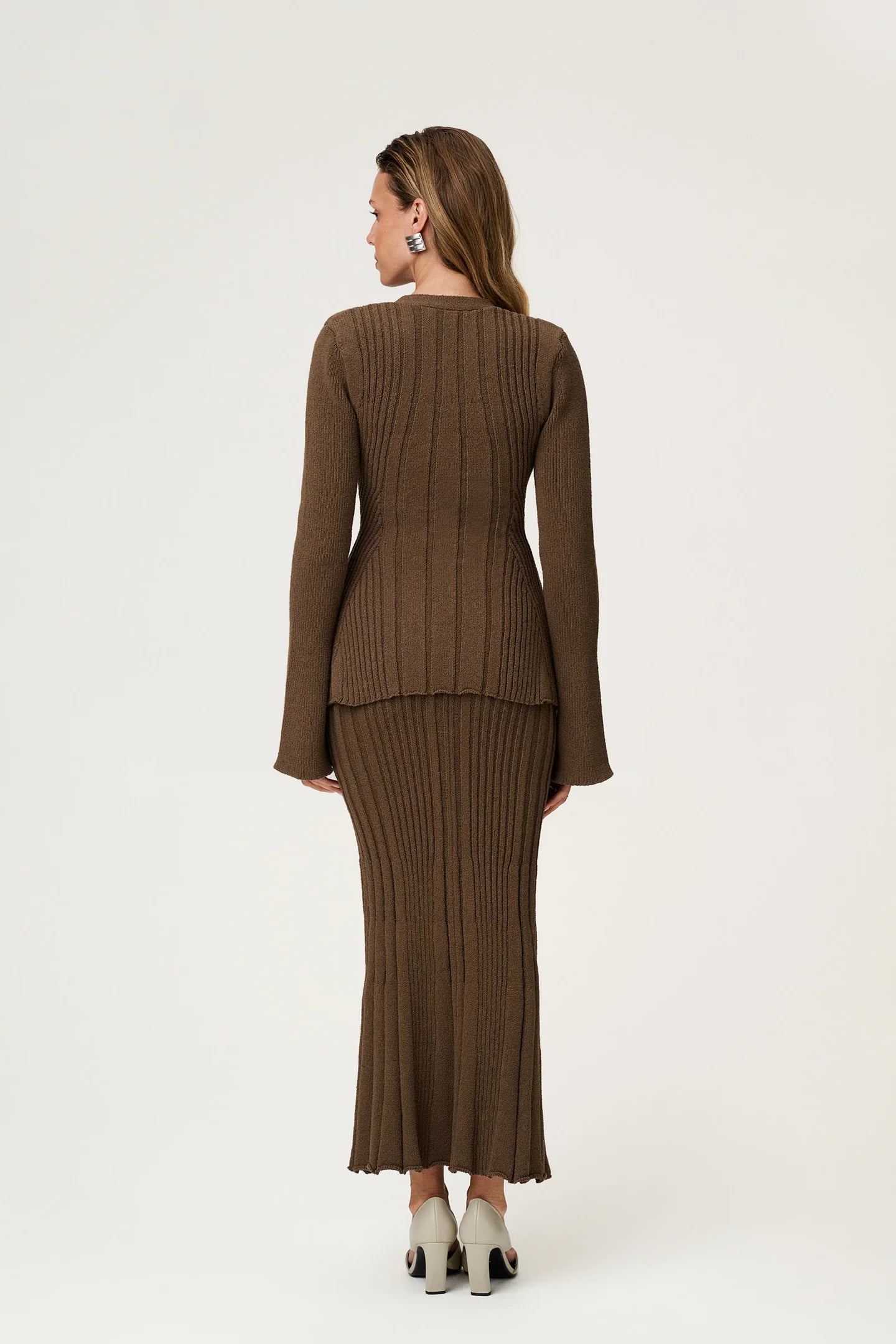Cardiganen har markerte skulderputer og en innsvinget midje som gir en elegant fasong. De lange ermene avsluttes med brede mansjetter for et raffinert uttrykk.