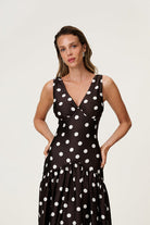 Toulouse maxi dress i brune prikker er en elegant kjole med feminine detaljer. Den dype V-halsen foran og bak gir et balansert uttrykk, mens diskret rynking over bysten og et A-formet snitt over hoftene skaper en flatterende silhuett. En høy splitt foran og plissert skjørt gir kjolen bevegelse og letthet, mens den skjulte glidelåsen bak sørger for en sømløs finish.