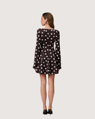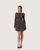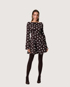 Riom mini dress i brown dot har en innsnevret midje og en voluminøs silhuett som gir et leken og flatterende uttrykk. Den brede båthalsen og trompeterme skaper elegant bevegelse, mens glidelåsen bak sørger for en jevn og fin finish. En feminin kjole som passer perfekt til både hverdag og fest.