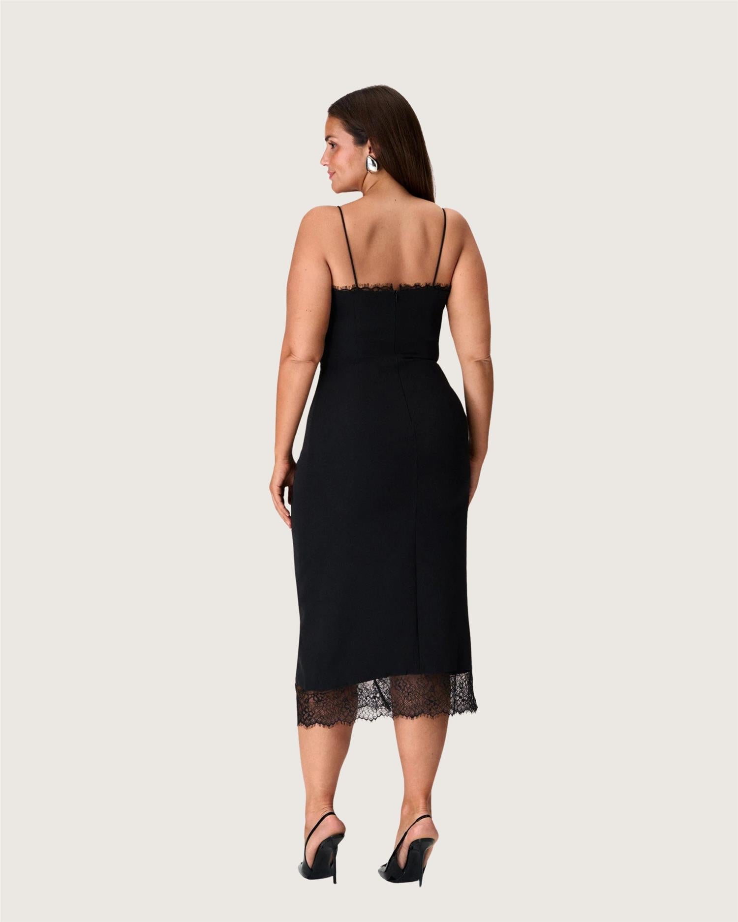Spezia midi dress i svart er en elegant og feminin kjole med vakre blondedetaljer. Den har balconette-liv, tynne spaghetti-stropper, skjult glidelås i ryggen og en høy splitt foran som gir et sofistikert uttrykk. Kjolen er designet for å være smalere i midjen for å fremheve figuren, og det elastiske vevde materialet gir en behagelig og flatterende passform.