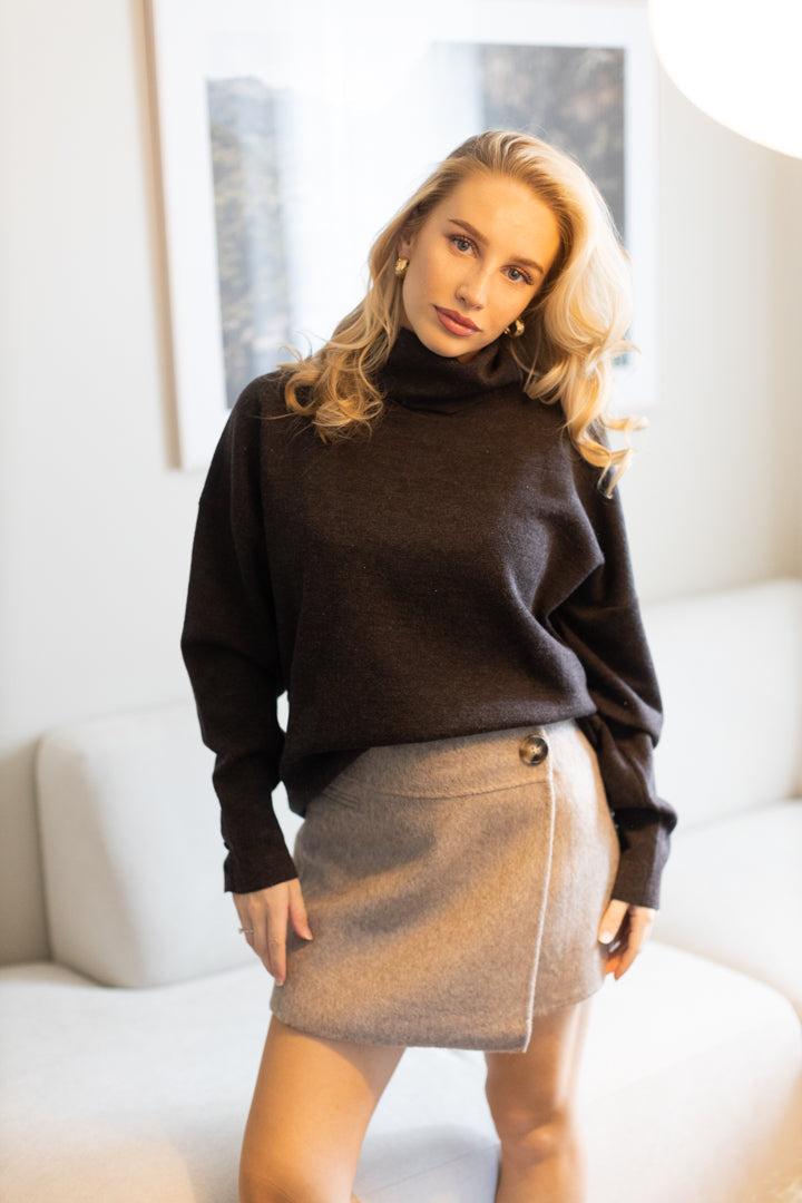 Tyra Merino Sweater er en vid, lett cropped genser med droppede skuldre og høy hals. Den har lange ermer og lekre velourknapper på mansjettene – et elegant og moderne uttrykk kombinert med komfortabel merinoull.