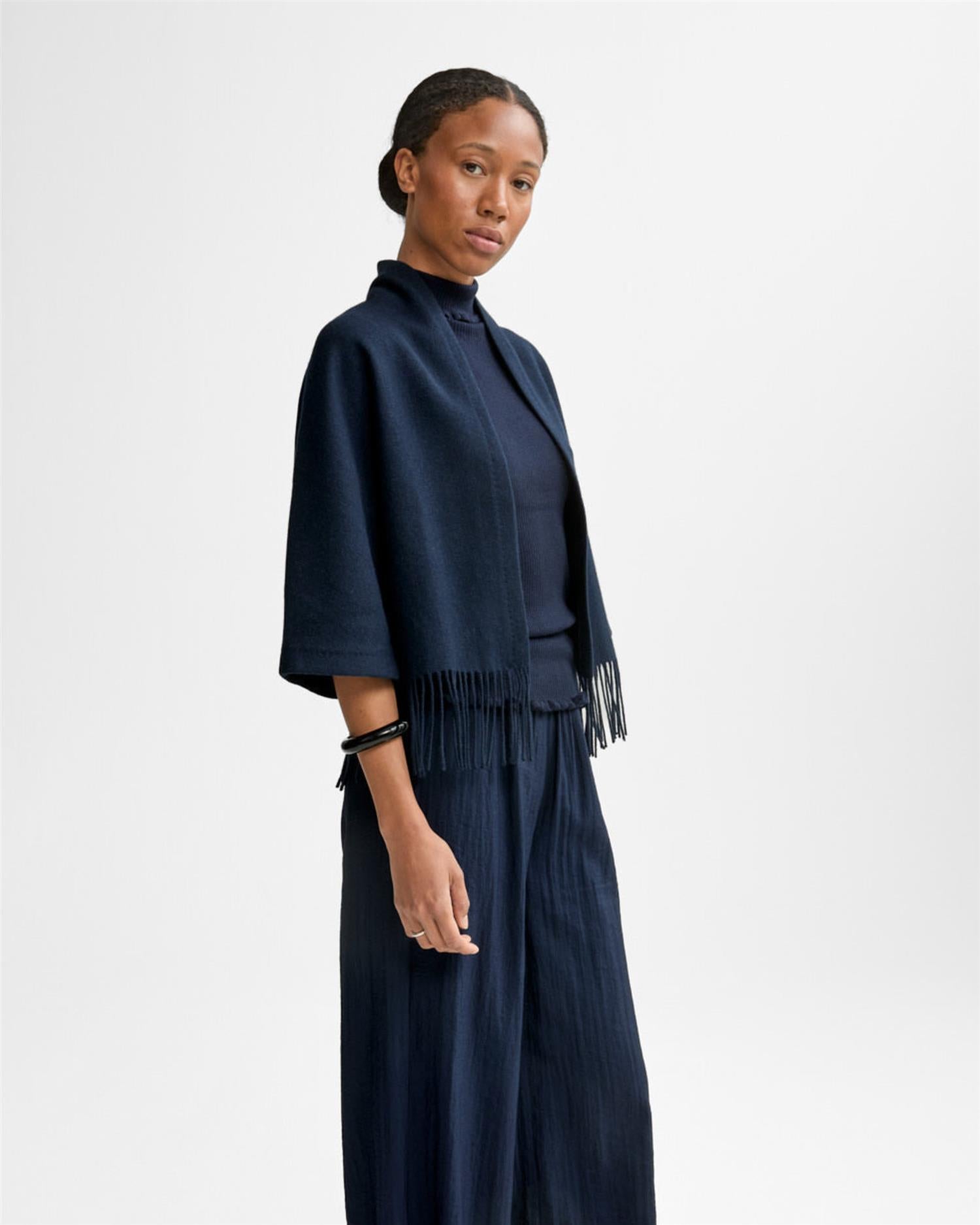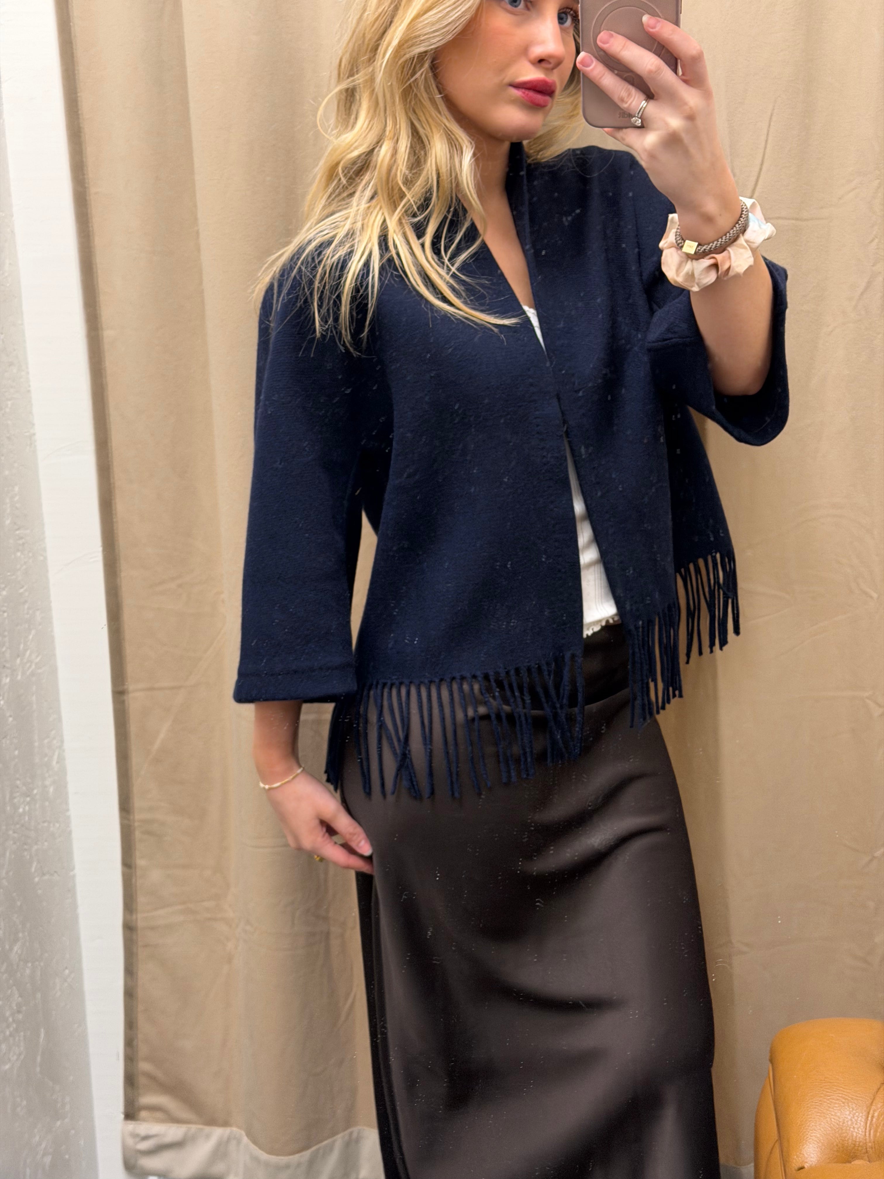 Keyla Lambswool Jacket er laget i myk og varm lammeull, med et rent og tidløst design. Jakken er avsluttet med frynser nederst som gir et elegant og karakteristisk uttrykk. Innsiden er pent ferdigstilt med kantbånd i bomull. Et allsidig plagg som fungerer like godt innendørs som utendørs.