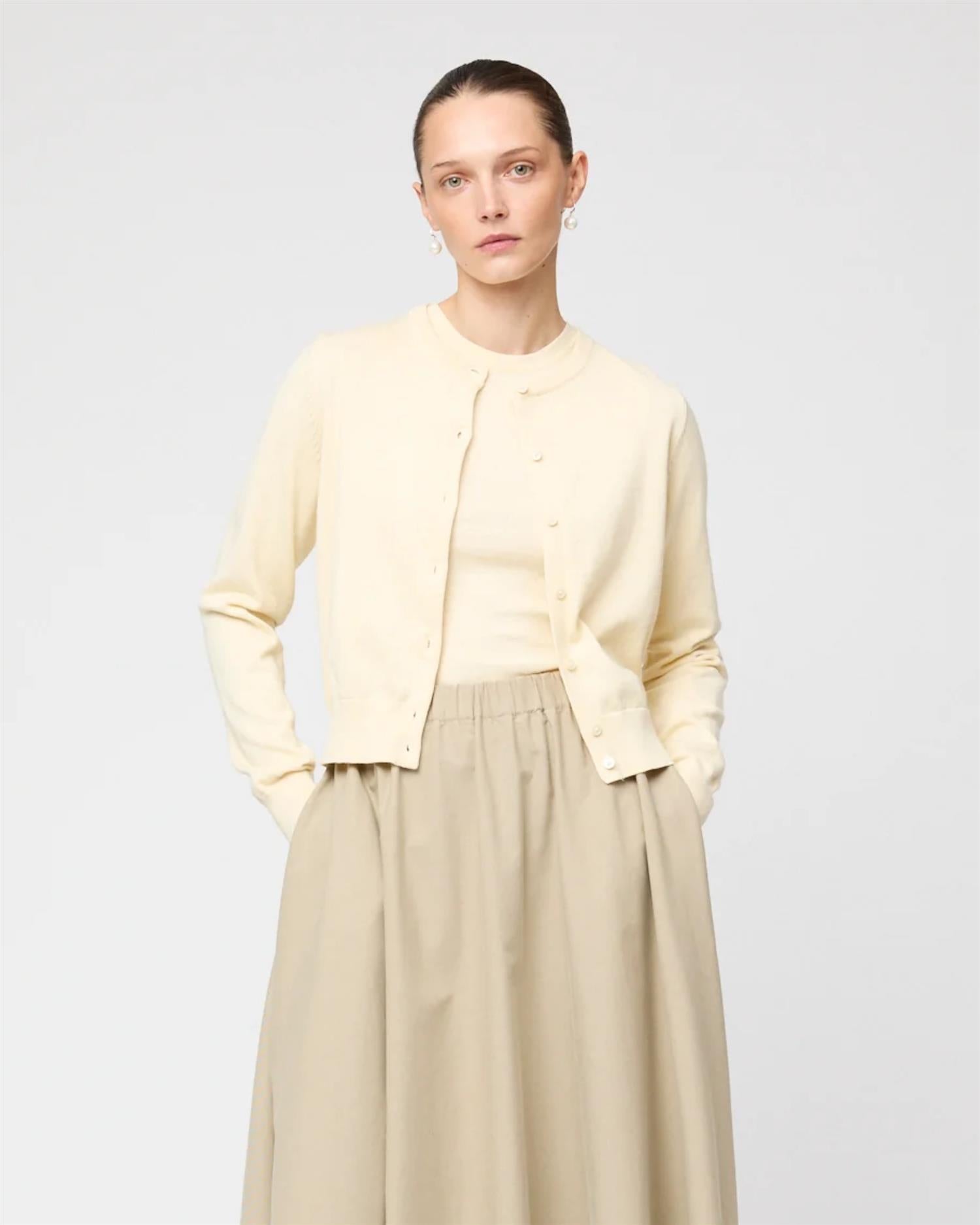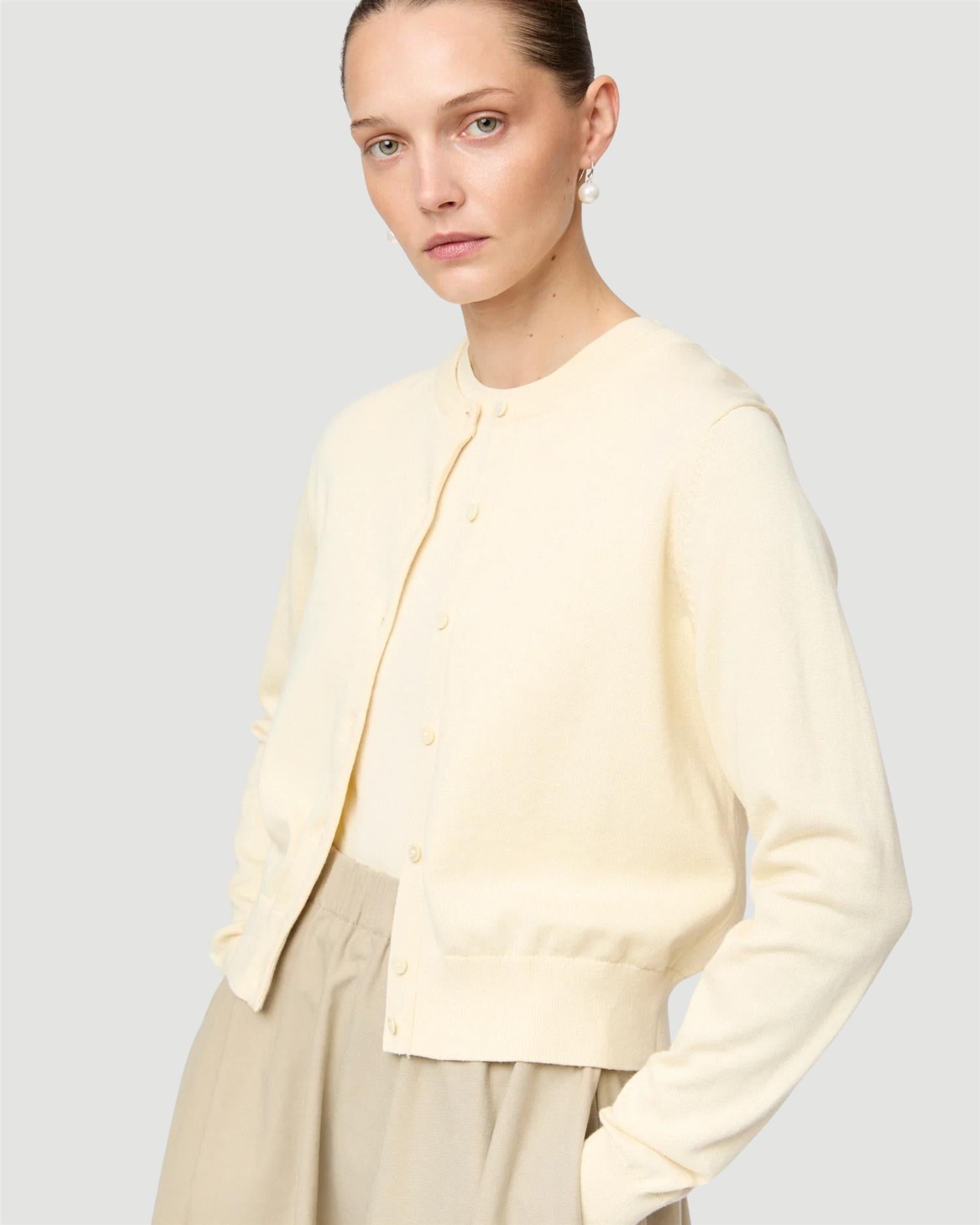 Lett og myk cardigan i bomull–kashmir-blanding (95 % bomull, 5 % kashmir). Croppet lengde som sitter i midjen, perfekt sammen med Cotton Cashmere Tank for et rent og moderne uttrykk.