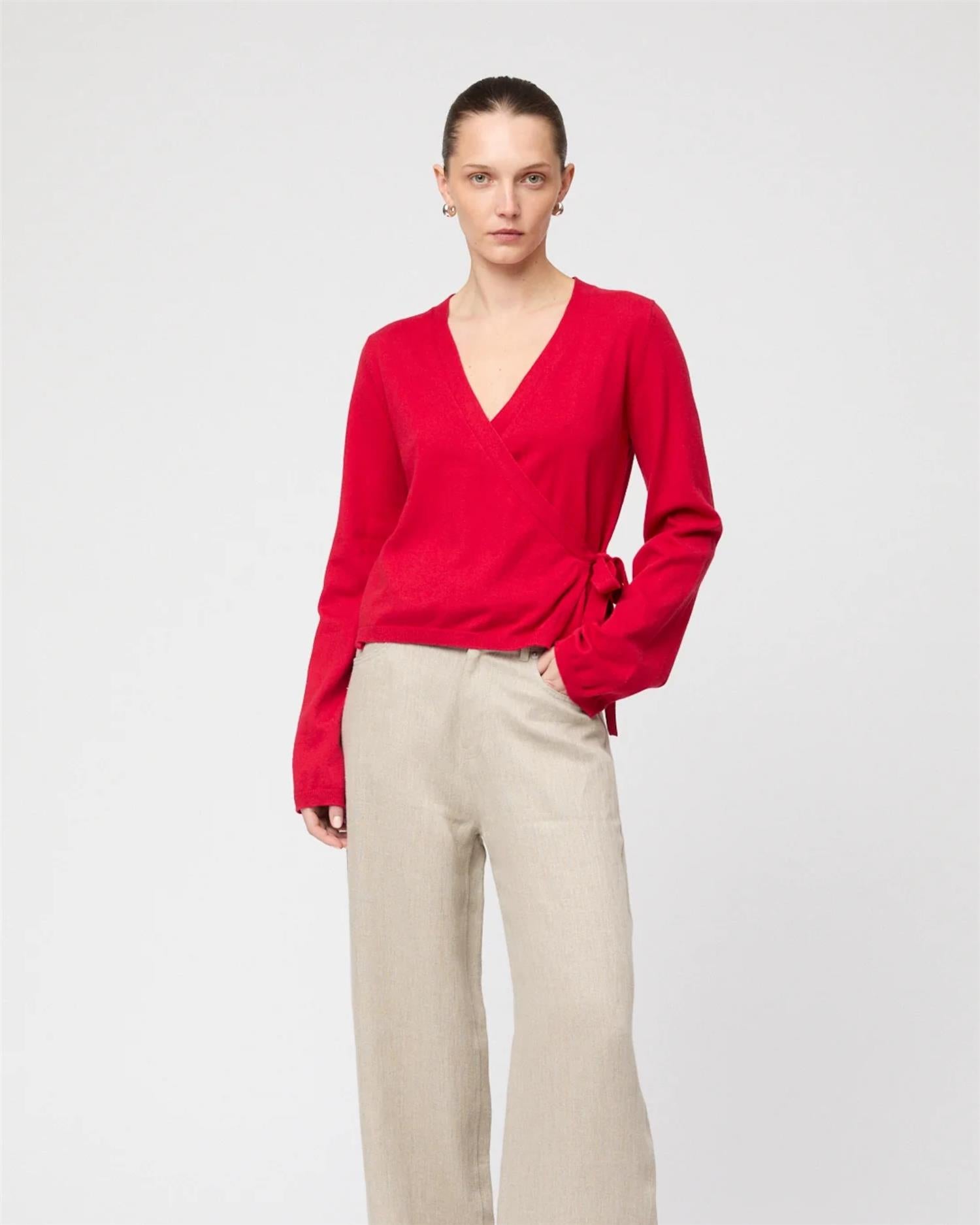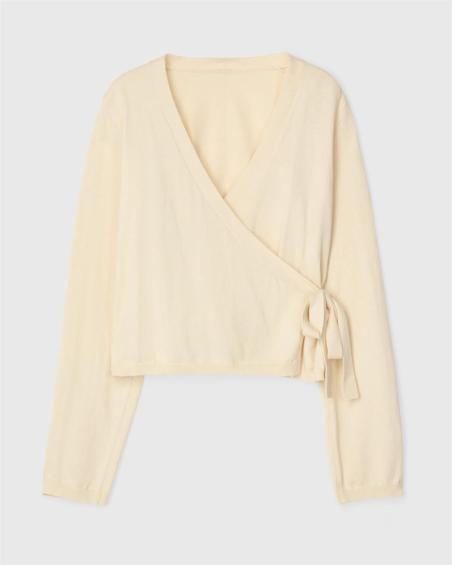 Wrap Cardigan er strikket i en myk bomull–kashmir-blanding og er inspirert av klassisk ballettstil. Den har knytebånd i midjen, lett utsvingte ermer og elegante ribbestrikkede kanter. Den lette kvaliteten gjør den perfekt til lag-på-lag og gir et sofistikert preg til hverdagsantrekket.