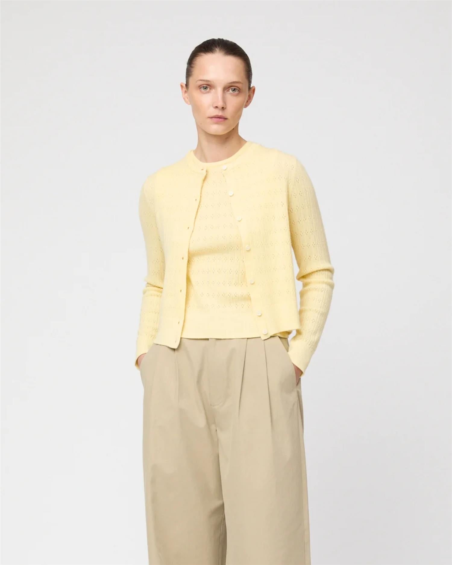 Pointelle Classic Tank er en tidløs garderobefavoritt i en myk og delikat pointelle-strikk. Den enkle silhuetten gjør den perfekt å bruke alene, eller sammen med Classic Merino Cardigan eller Pointelle Classic Cardigan for et koordinert og elegant uttrykk.