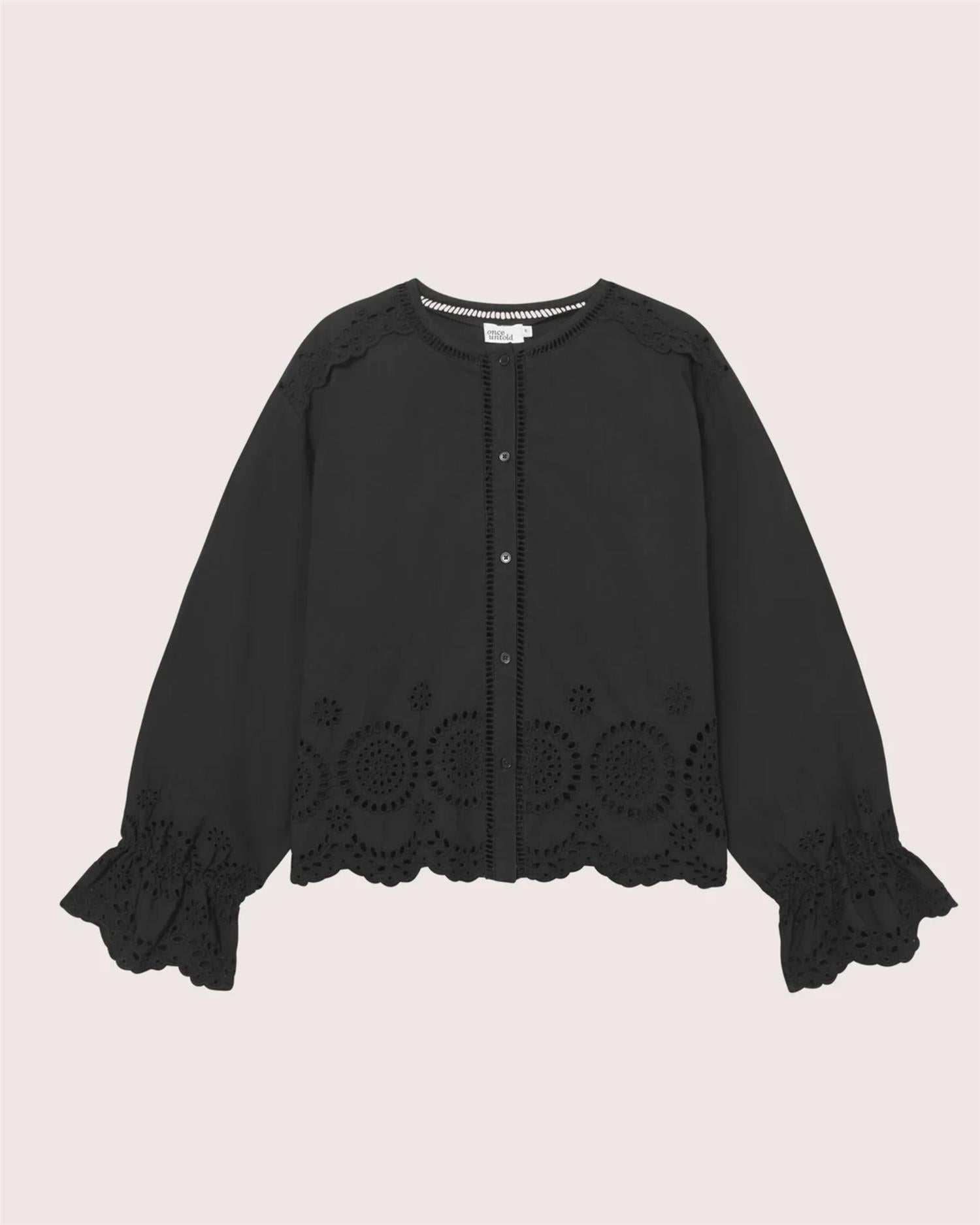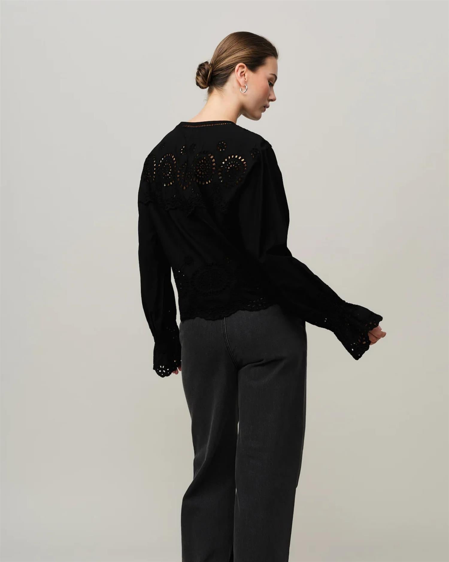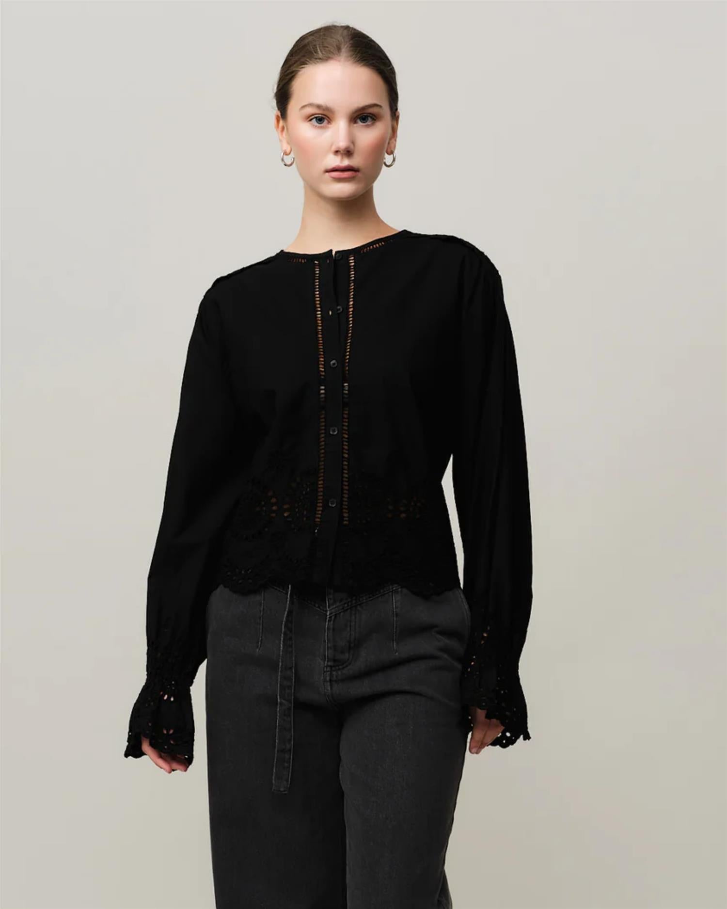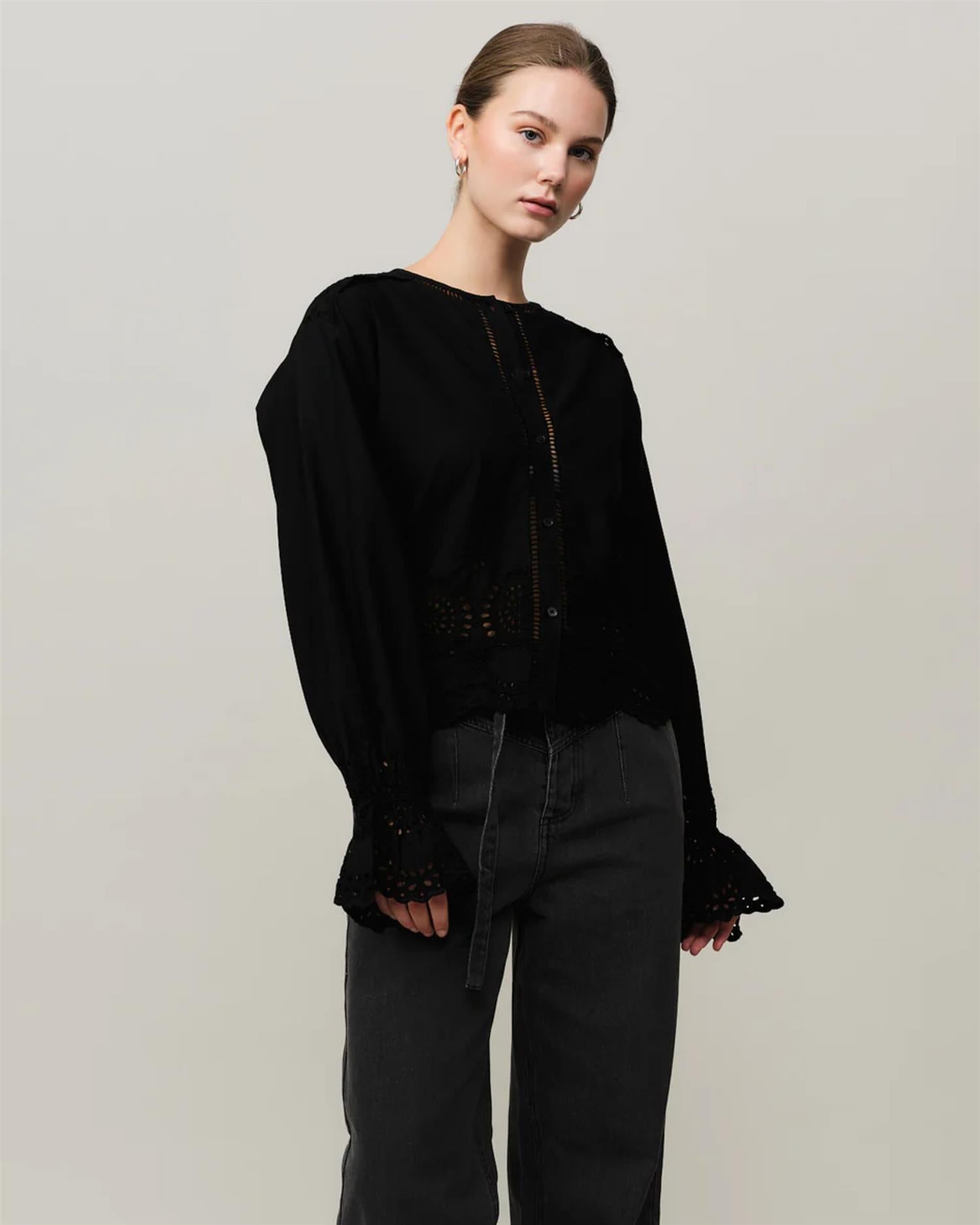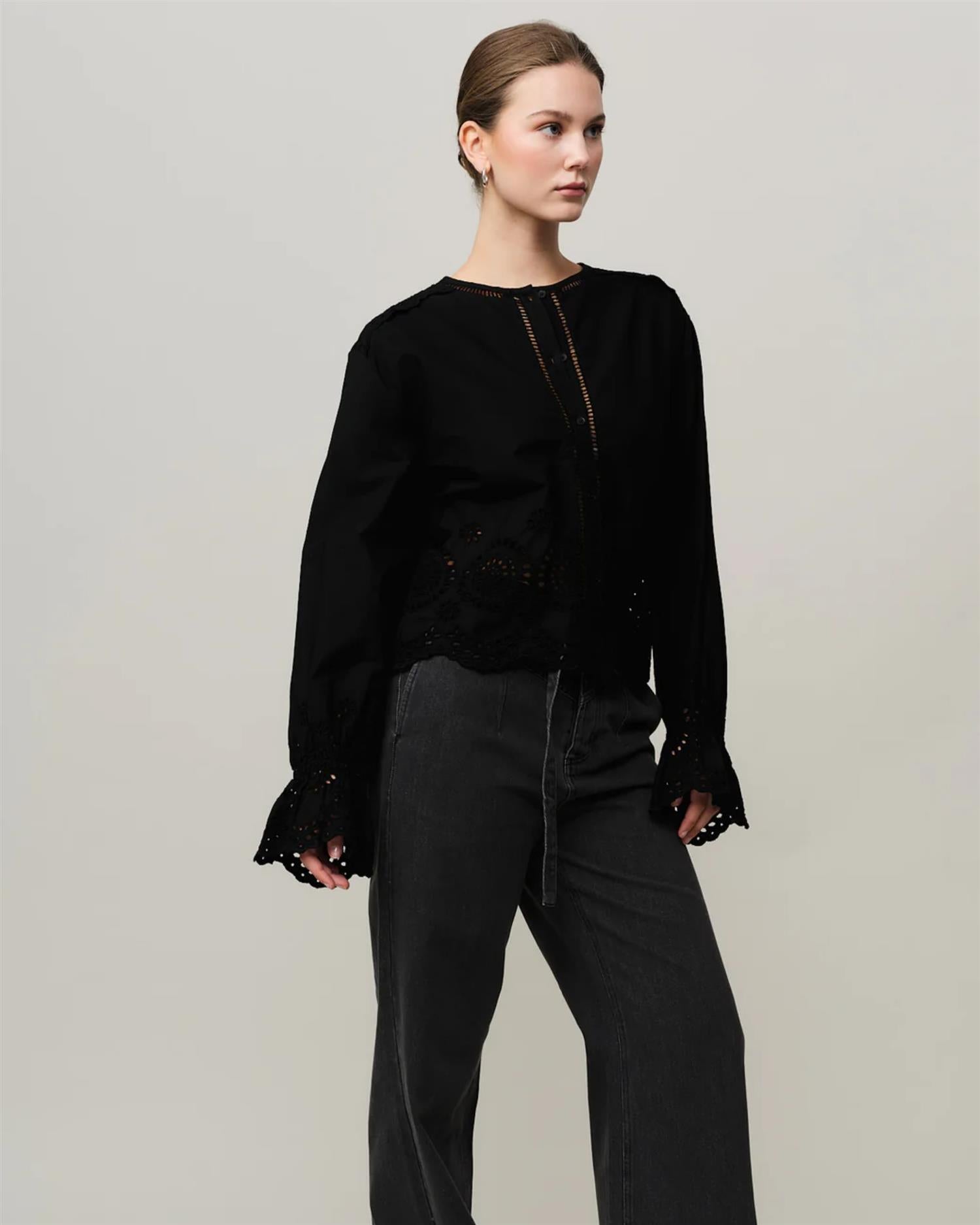 Bea Blouse er en elegant og feminin bluse med delikate broderie-detaljer langs hals, ermer og nederkant, som gir et romantisk uttrykk med et hint av vintage. Blusen er designet med en avslappet passform, lange ermer og en lett utsvingt fald som skaper en myk og flatterende silhuett.