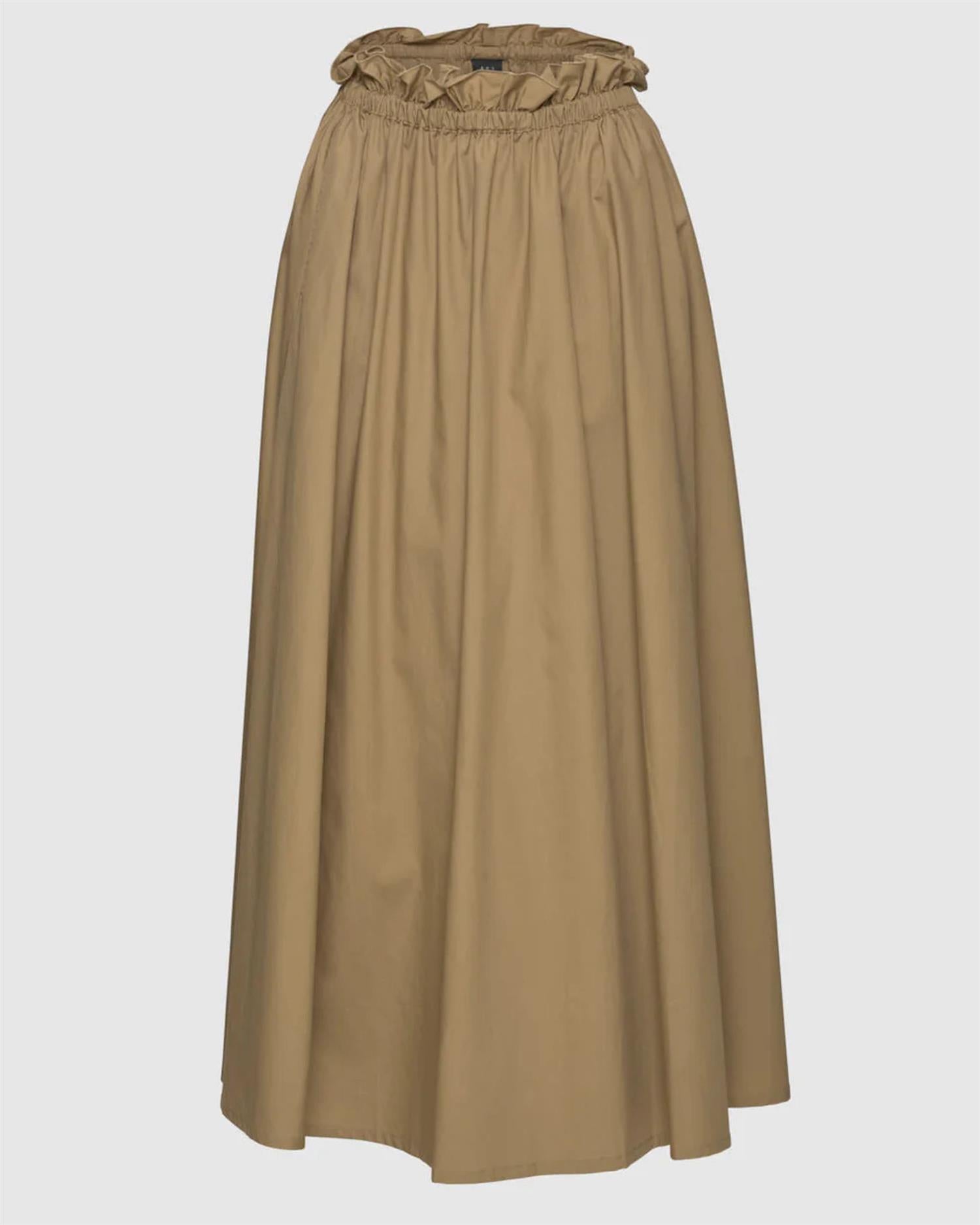 Daija Poplin Skirt er laget i en lett og behagelig blanding av Tencel og bomull. Skjørtet har elastisk midje for komfortabel passform, praktiske sidelommer og en feminin volangdetalj over linningen som gir et mykt og elegant uttrykk.