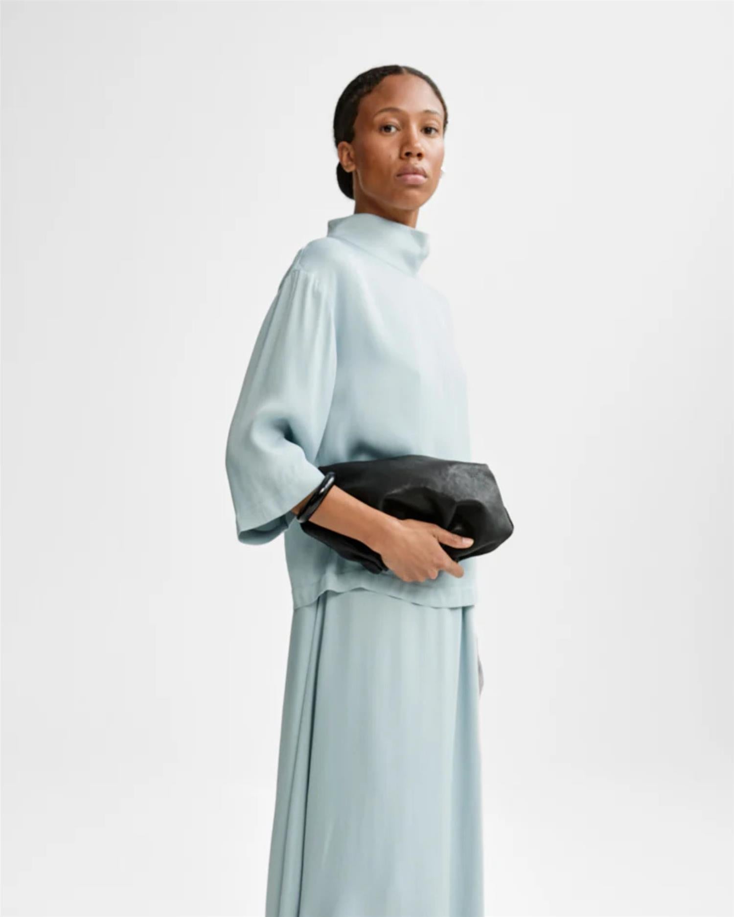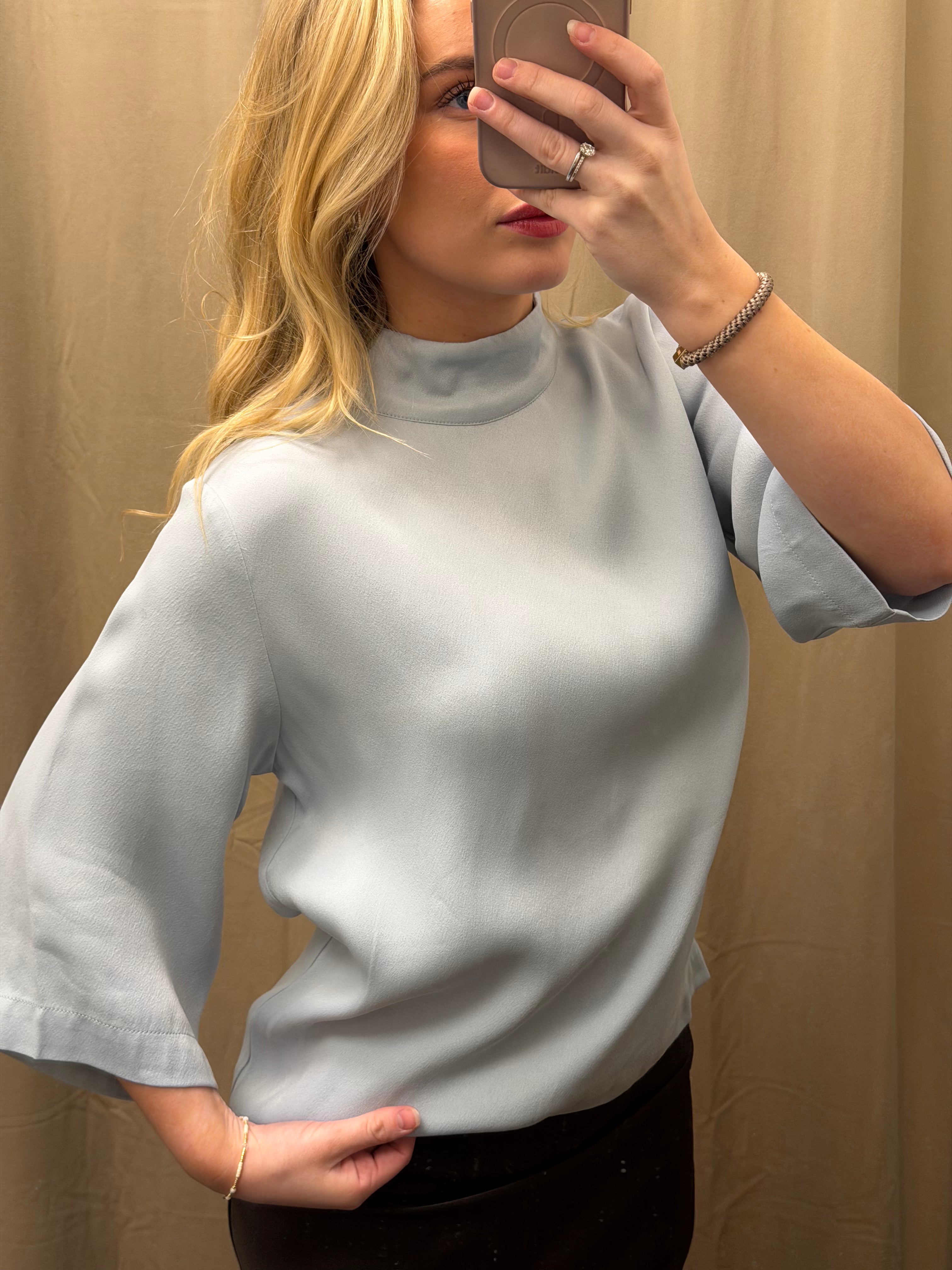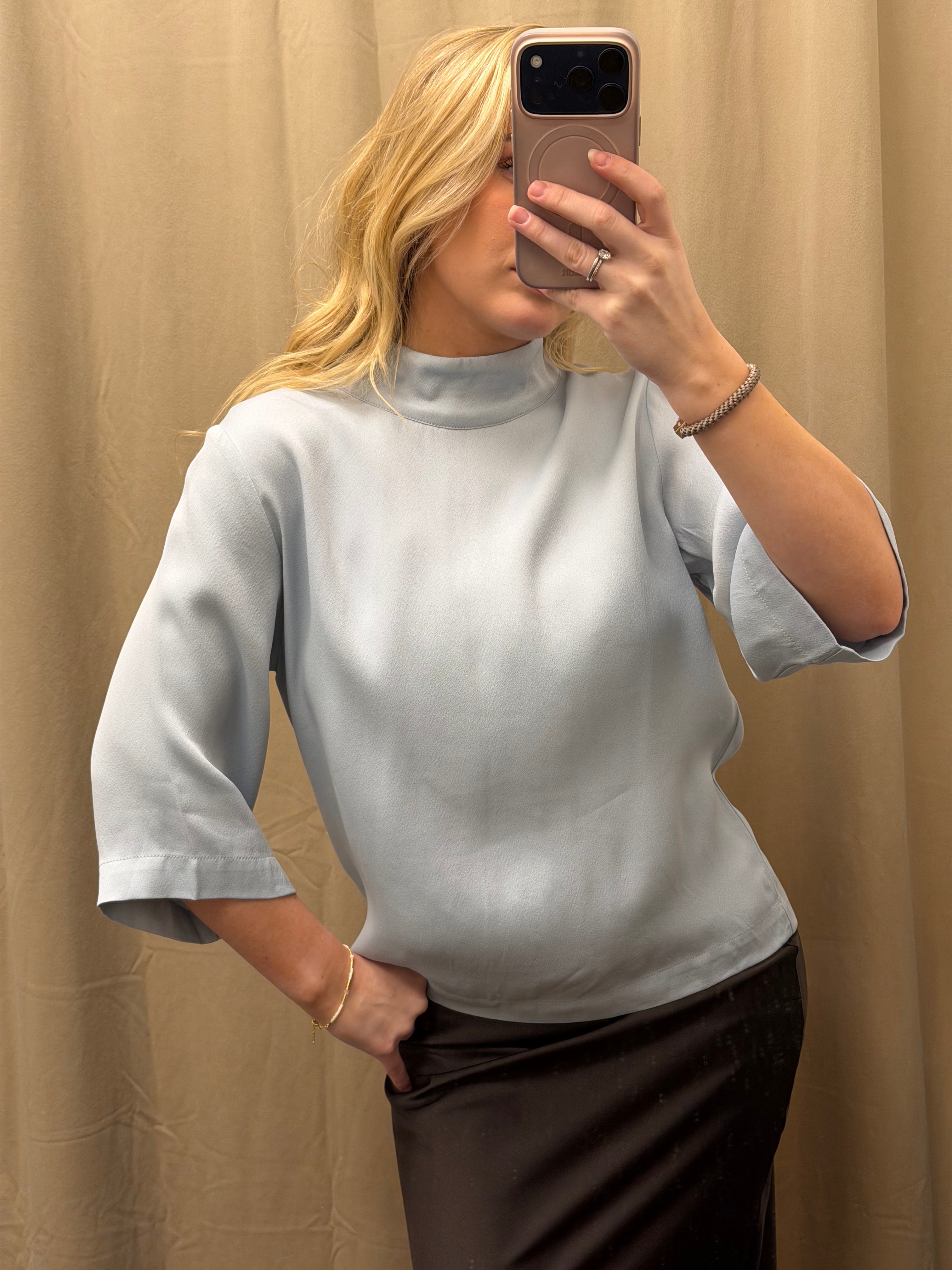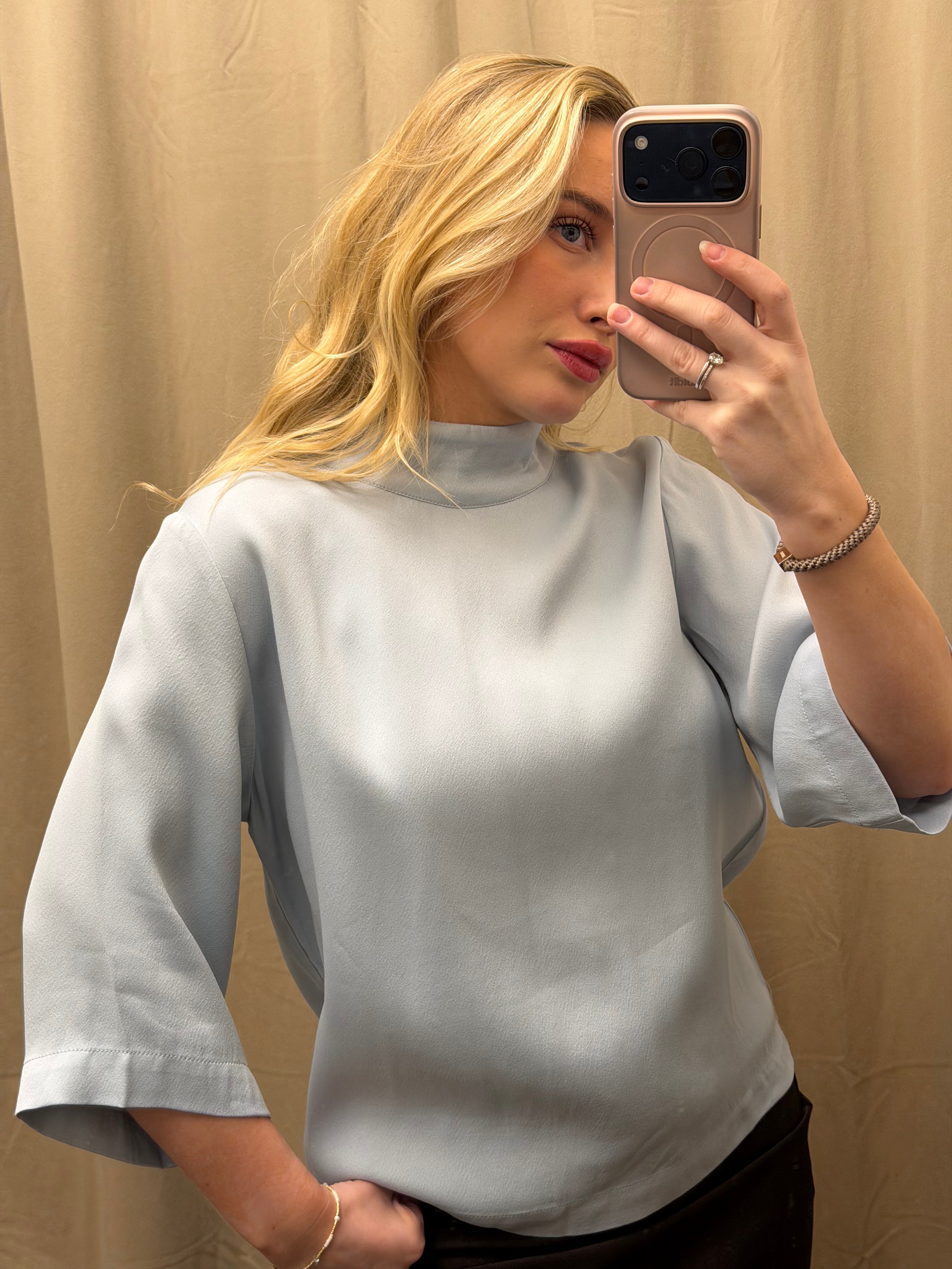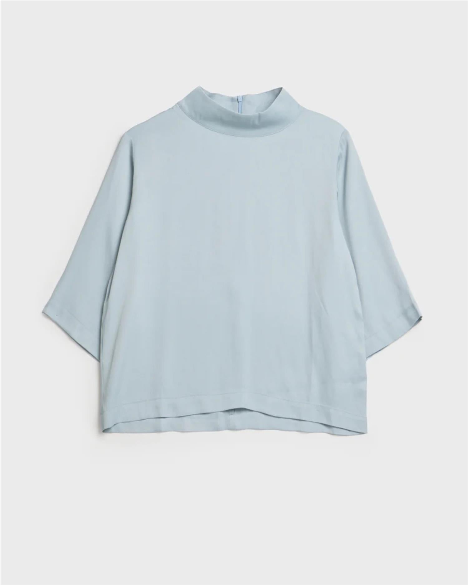 Tilla Top er en avslappet topp i myk viskose med 3/4-lange ermer og en kort, stående krage som gir et rent og elegant uttrykk. Toppen lukkes med skjult glidelås midt bak for en pen og sømløs finish.