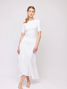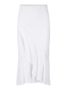 Petrine er et langt omslagsskjørt som knytes i livet. Skjørtet har volanger nederst.