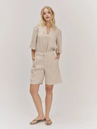 Fie er en lang linshorts med lommer, glidelås og knapp i livet. Den er et perfekt plagg for en kapselgarderobe til sommeren.