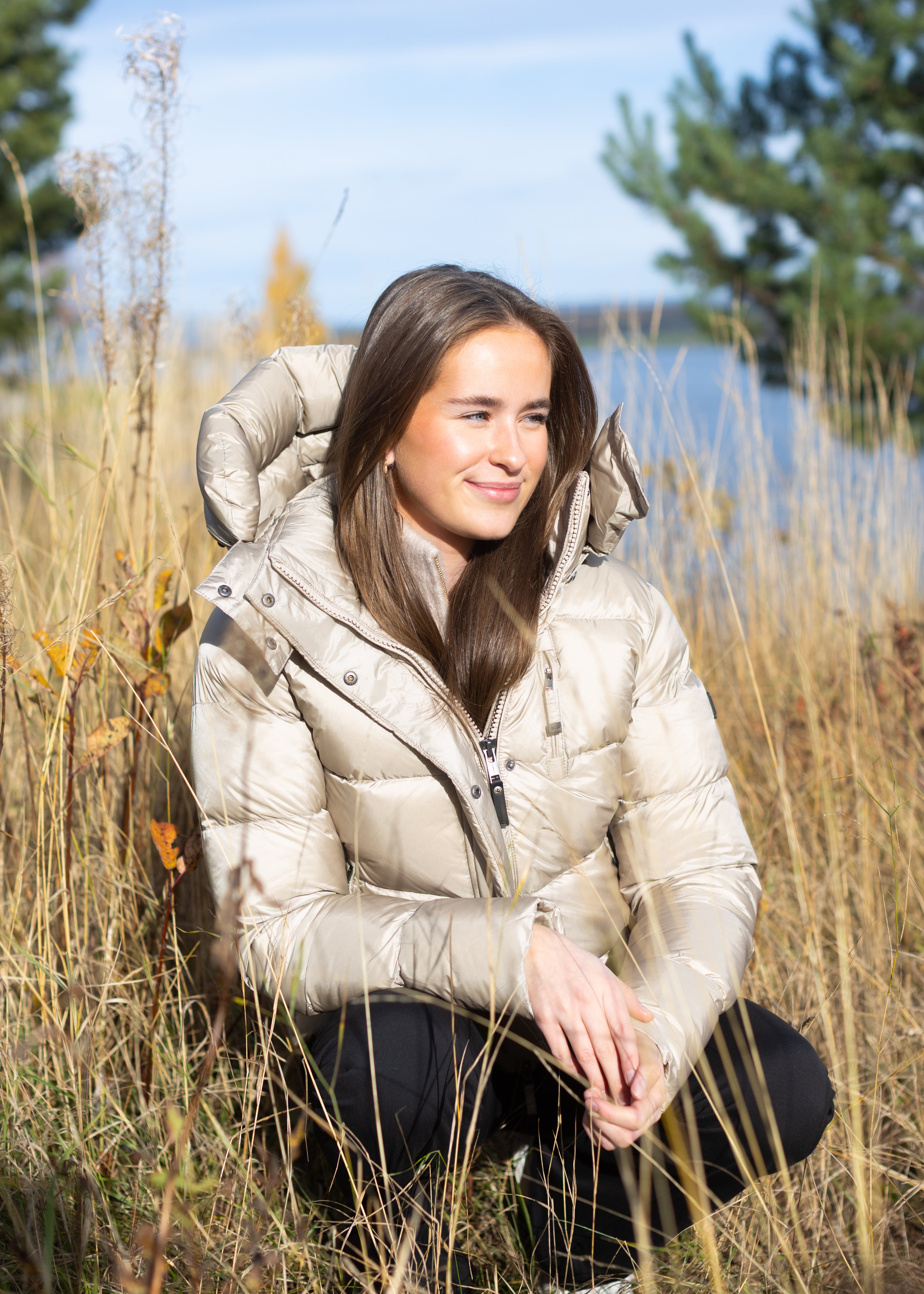 Stella jakke kombinerer moderne design med funksjonelle detaljer. Den korte lengden gir et urbant preg, mens den avtakbare hetten med justerbar snor gir fleksibilitet etter vær og behov. Ribbestrikkede mansjetter i myk bomull holder kulden ute og sikrer komfort. En allsidig jakke som fungerer like godt i byen som på fjellet – perfekt for deg som ikke vil gå på kompromiss med verken stil eller funksjonalitet.