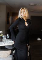 Basel-kjolen er en elegant kjole i lett strikket materiale som faller naturlig mot kroppen. Den har en myk krage med en diskret toppknapp som skaper et raffinert utsnitt ved brystet. Dekorsømmer under bysten gir en subtil form, mens det utsvingte skjørtet tilfører bevegelse og en feminin silhuett. De lange ermene avsluttes med brede mansjetter som gir et skreddersydd preg.