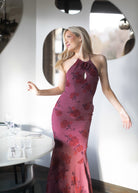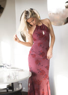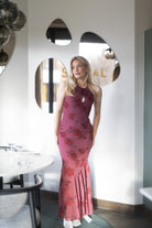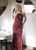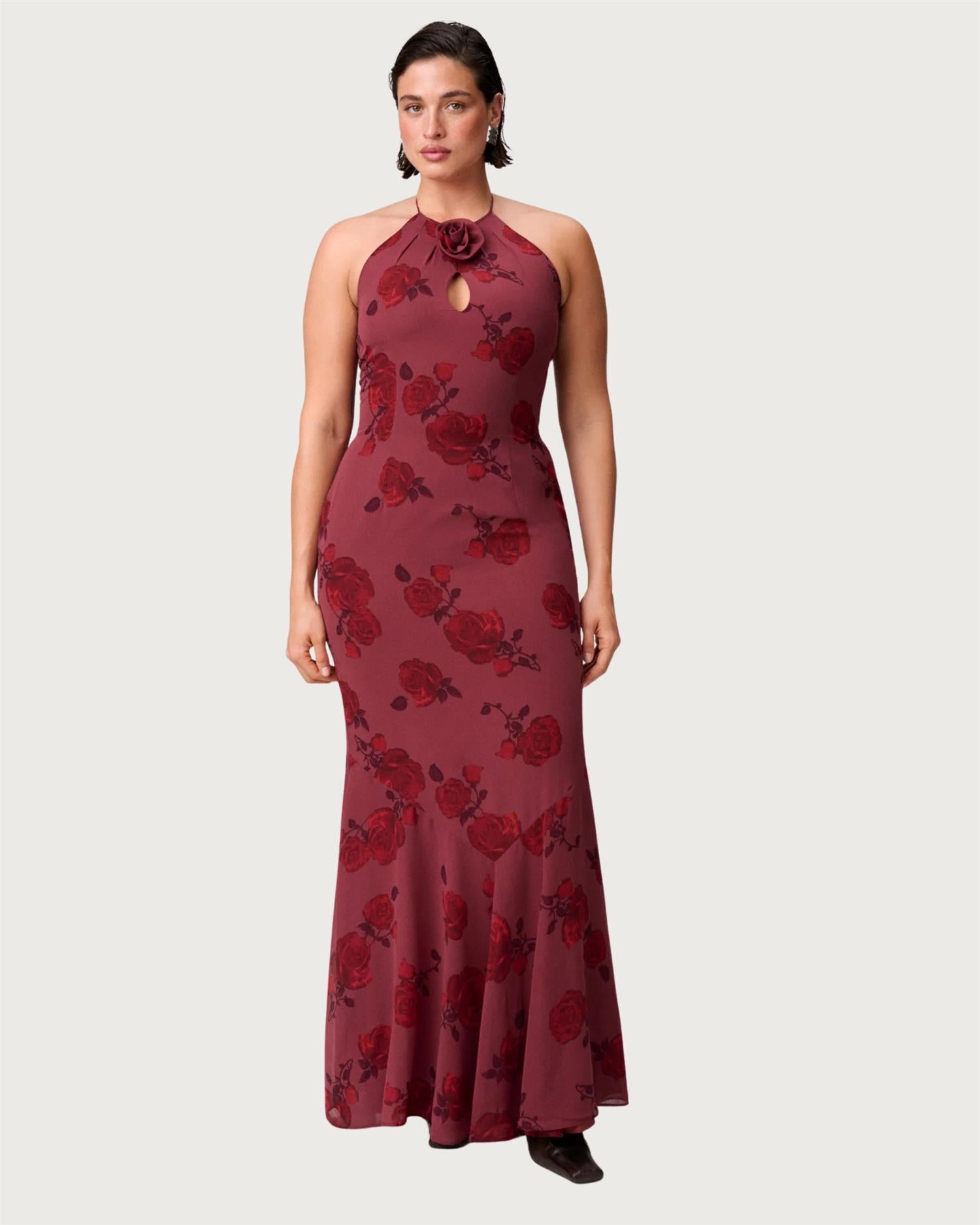 Rozzano Maxi Dress i fargen burnt sienna har et frontparti med utskjæring pyntet med en rose-detalj, samt en knyting i ryggen som gir en feminin og elegant silhuett. Kjolen har en figursydd mermaid-passform, er helfôret og har en skjult glidelås i siden for et sømløst uttrykk.