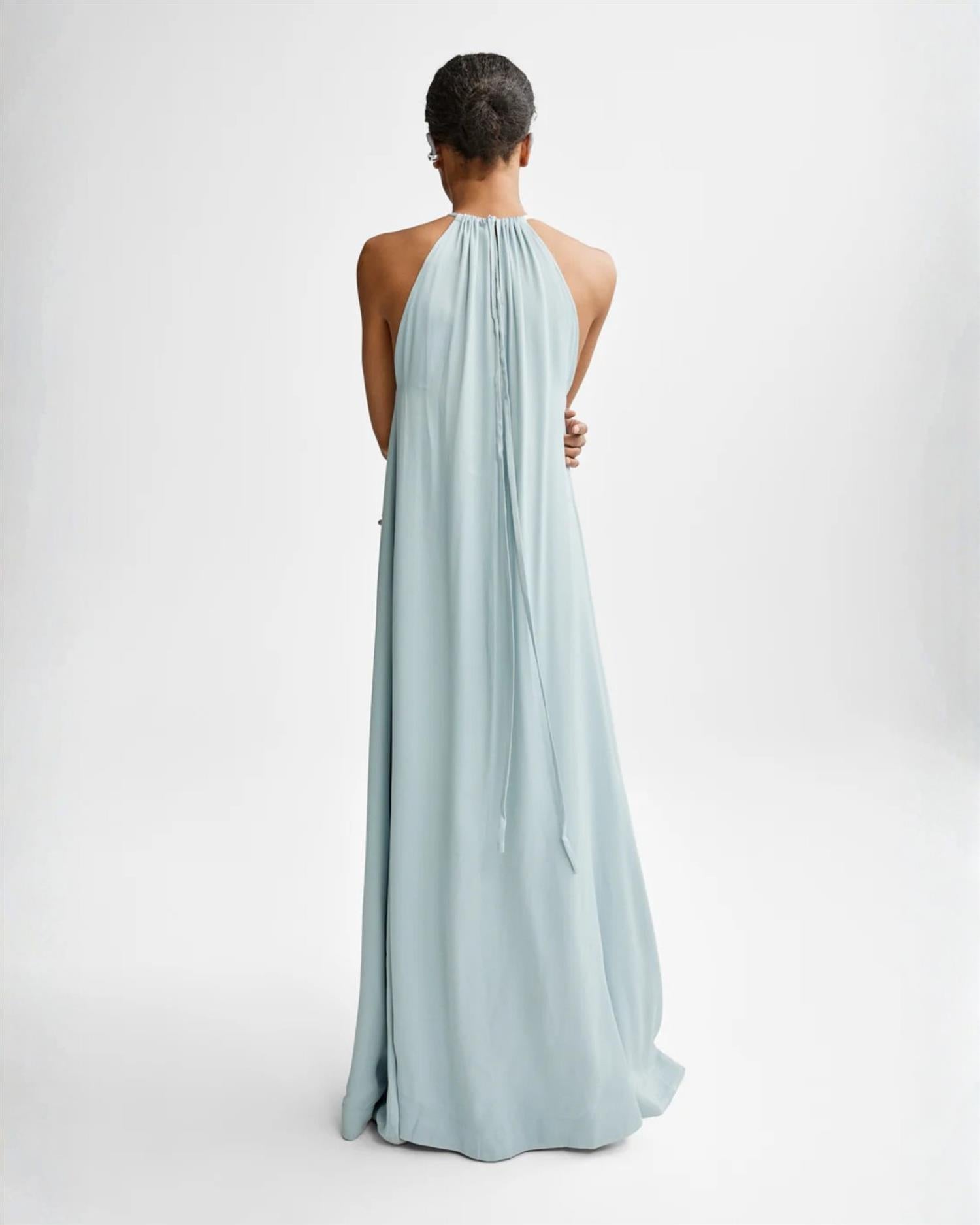 Dalina Viscose Dress er en lang og elegant kjole laget i 100 % viskose med et tungt og vakkert fall. Utringningen kan knytes for et mer sofistikert uttrykk, eller bæres åpen for en avslappet og feminin look.