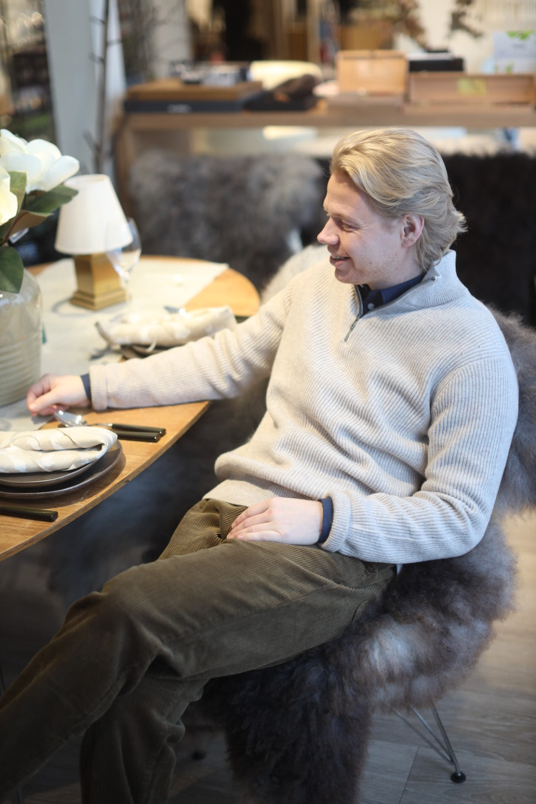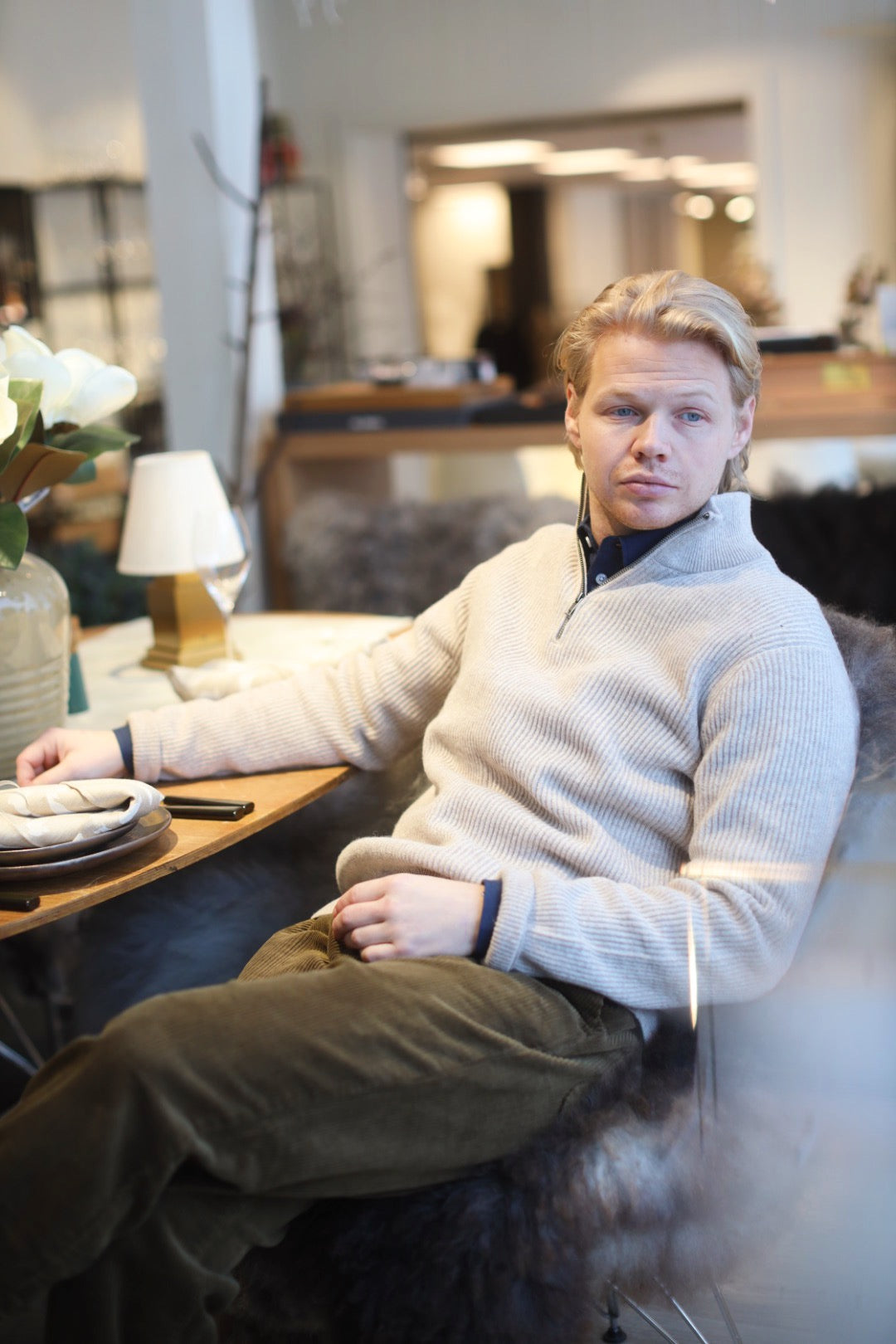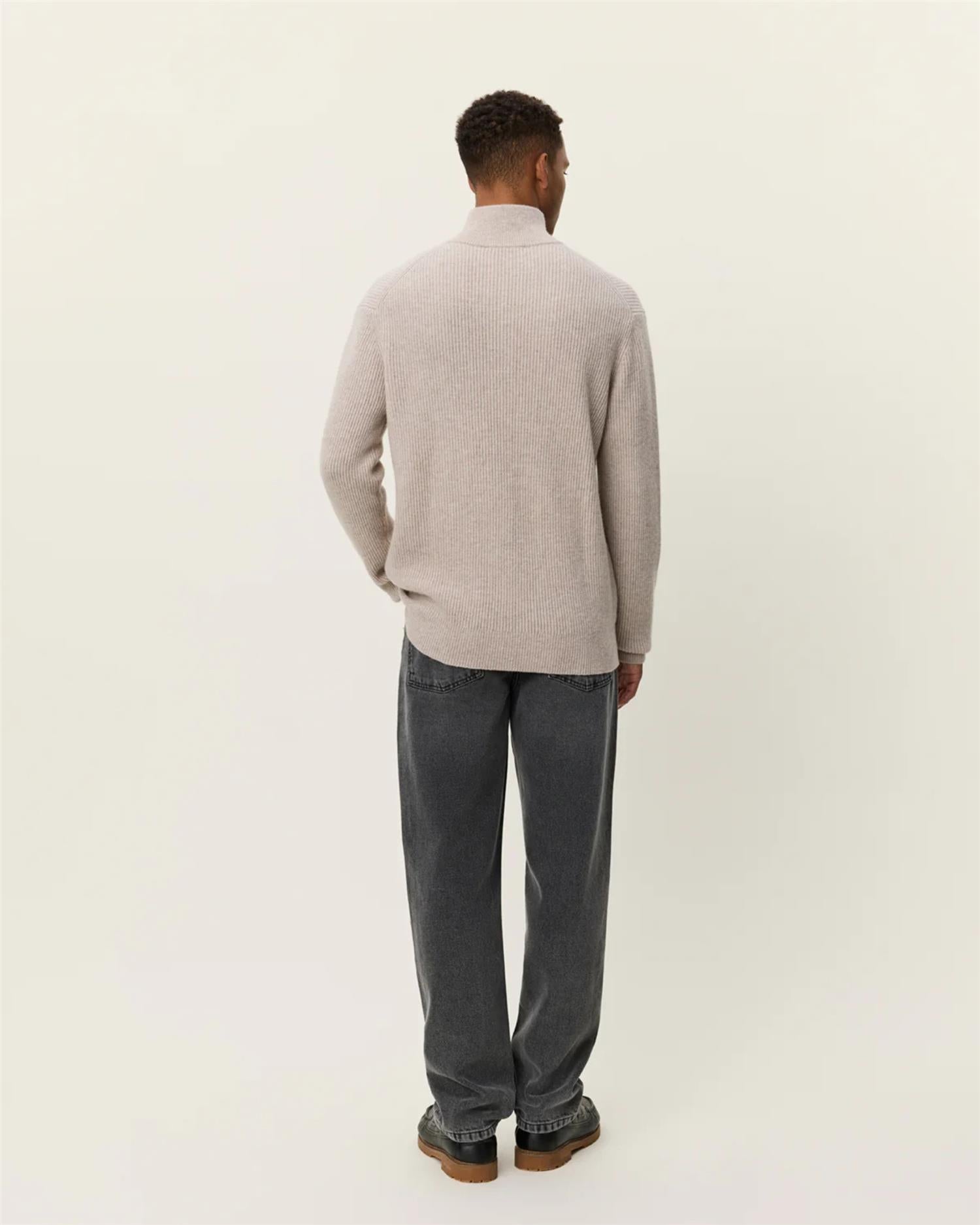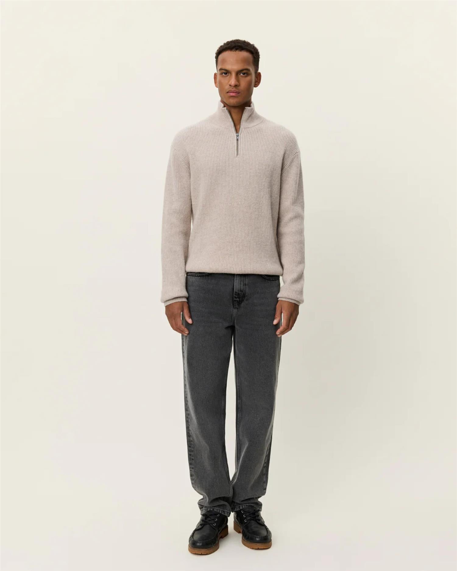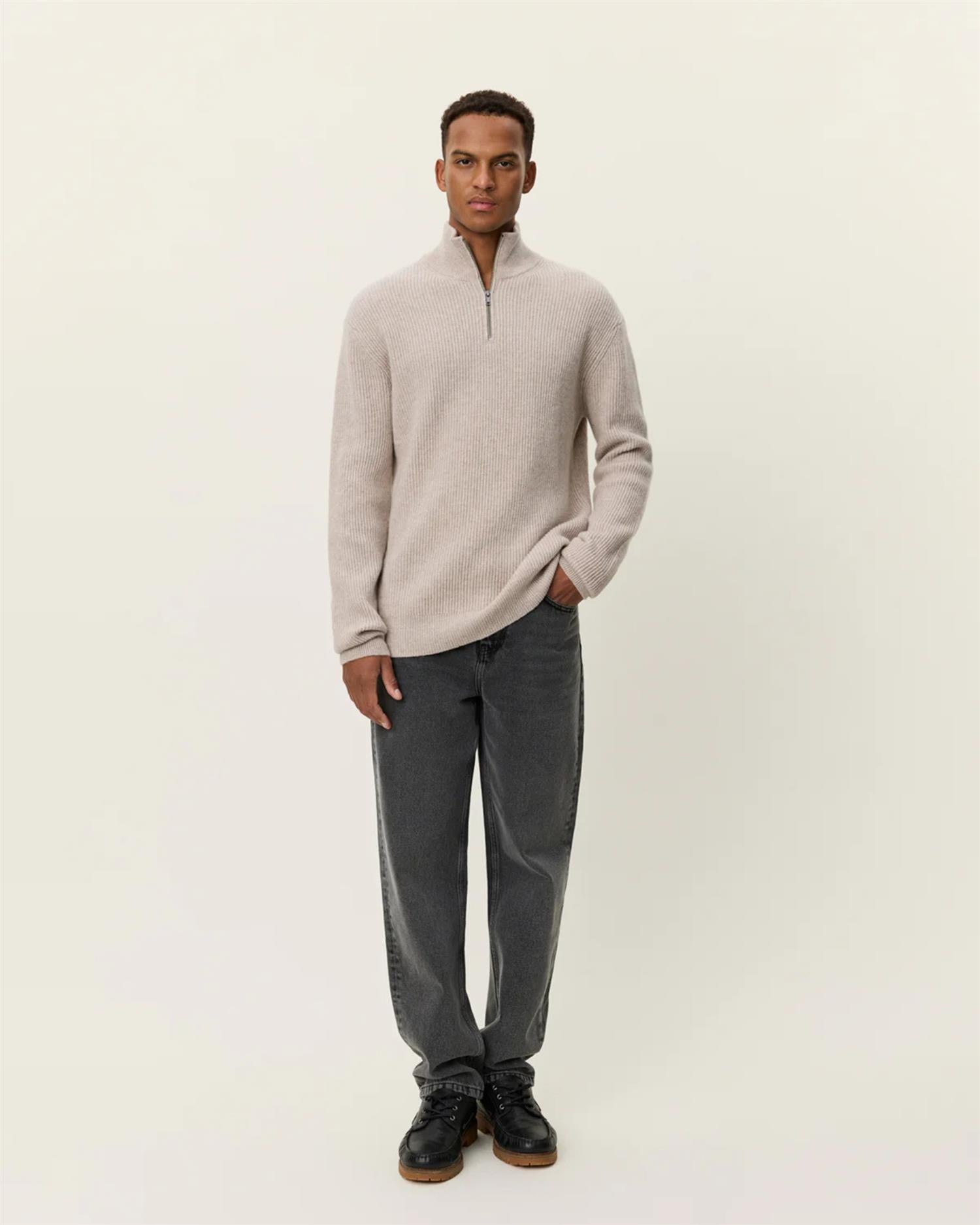 Eduard er en midweight half-zip genser i merinoull, strikket i half-cardigan struktur som gir både varme og en raffinert overflate. En allsidig og tidløs hverdagsfavoritt med regular fit og ribbede detaljer.