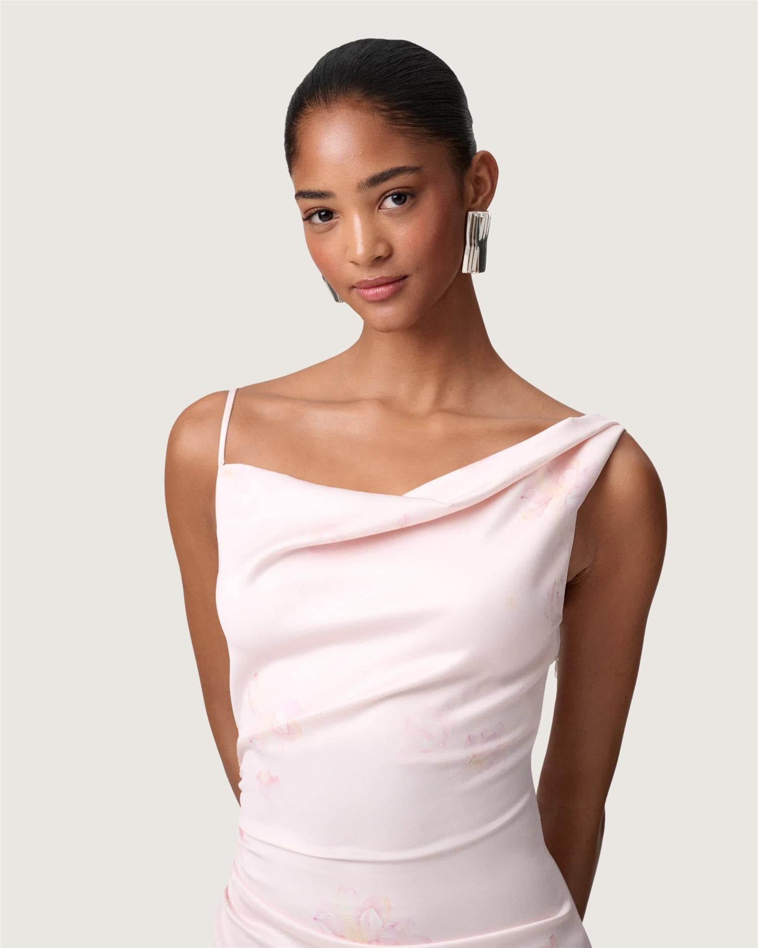 Almeria Maxi Dress i pastel pink med diskret blomsterprint er en elegant og feminin kjole med én skulder og drapert diagonal utringning. Kjolen har en rynket midjedetalj, skjult glidelås i siden, maxilengde og en stilfull splitt i sidesømmen. Designet med smalere midje for å fremheve figuren.