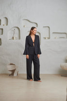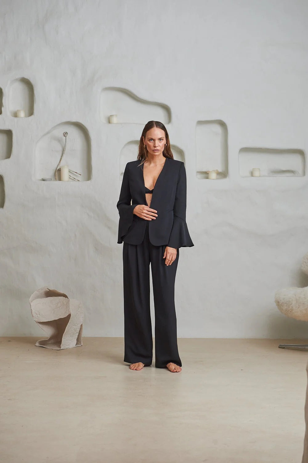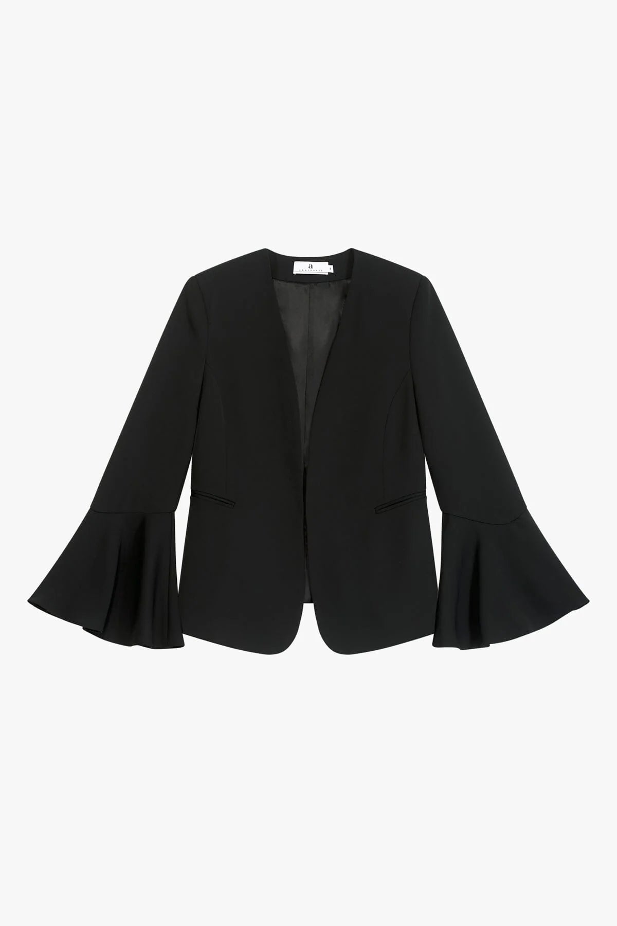 Feminin jakke/blazer laget i en kompakt, behagelig kvalitet. Modellen er designet i en skreddersydd passform med trompetermer og polstrede skuldre. Jakken lukkes med en enkel hem-løsning i livet. Noe ettersittende i fasongen.