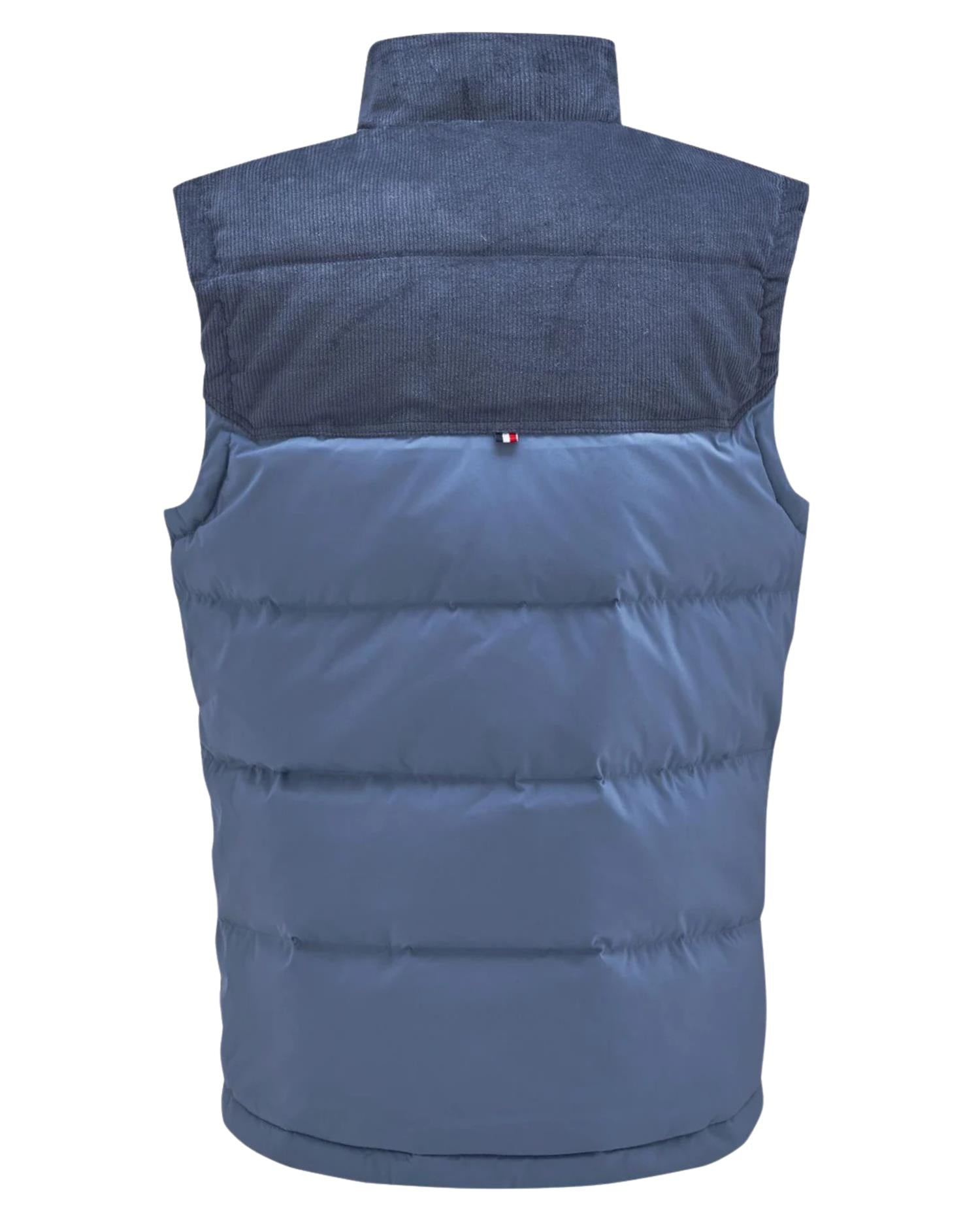 Andray Cord Vest kombinerer matt nylon med myk, matchende cordfløyel på skuldrene for et eksklusivt og moderne uttrykk. Vesten har to praktiske håndlommer i front og ikoniske detaljer som den subtile franske flaggstripen bak. Fylt med høykvalitets gåsedun gir den varme og komfort gjennom både høst og vinter.