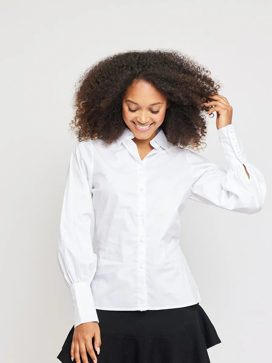 Thelma-skjorten er en figursydd bomullsskjorte med lange ermer og mansjetter med dekorative knapper. Enkel og elegant.